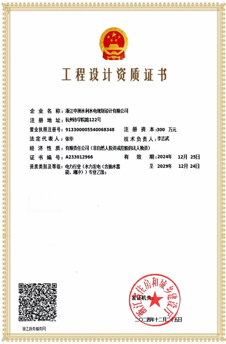 浙江中洲水利水电规划设计有限公司是水利部农村电气化研究所下属的全资公司,集水利水电全过程工程咨询、规划、设计于一体的技术密集型企业,持有工程咨询单位资信甲级(水利水电)、水利行业乙级、电力行业[水力发电(含抽水蓄能、潮汐)]专业设计乙级、测绘乙级、水土保持方案编制单位水平评价(3星)和水土保持监测单位水平评价(3星)等资质证书,公司拥有各类高级专业技术人员,持有国家各类注册执业资格证书,具有较雄厚的技术力量。